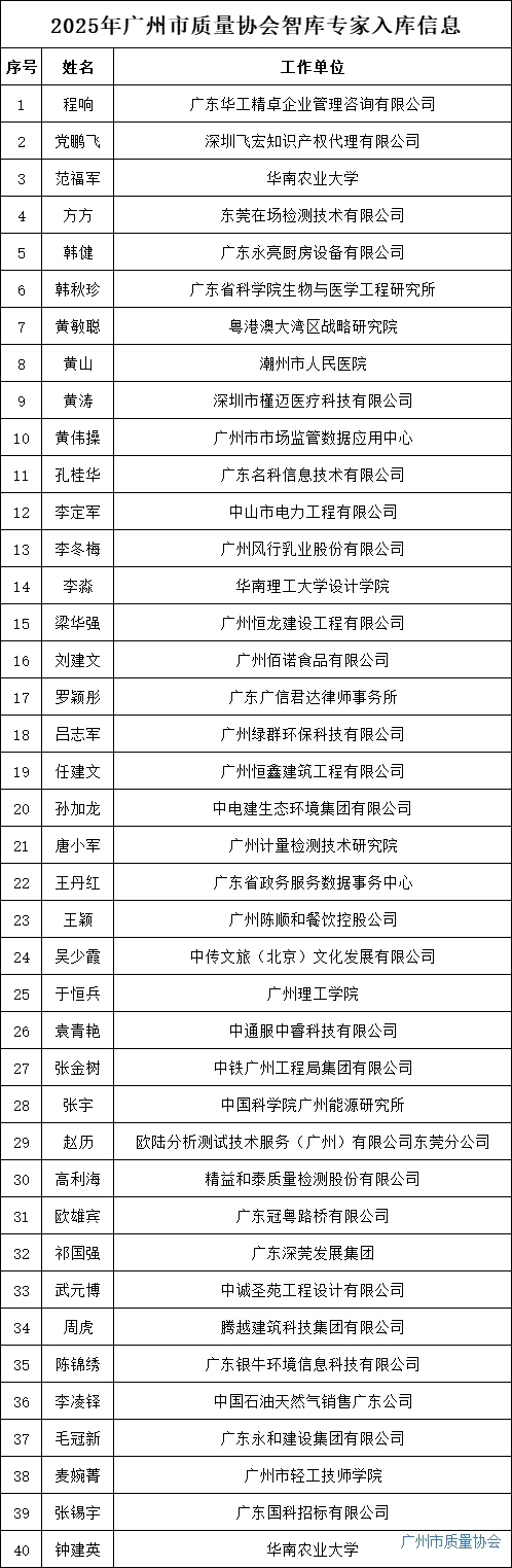 为进一步加强广州市质量领域专业人才队伍建设,充分发挥专家在质量领域的技术支撑和决策咨询作用,根据《广州市质量协会专家库管理办法》相关规定,经公开征集和特邀入库,拟确定40名同志为广州市质量协会协会智库专家,现将名单予以公示(见附件,专家排名不分先后)。