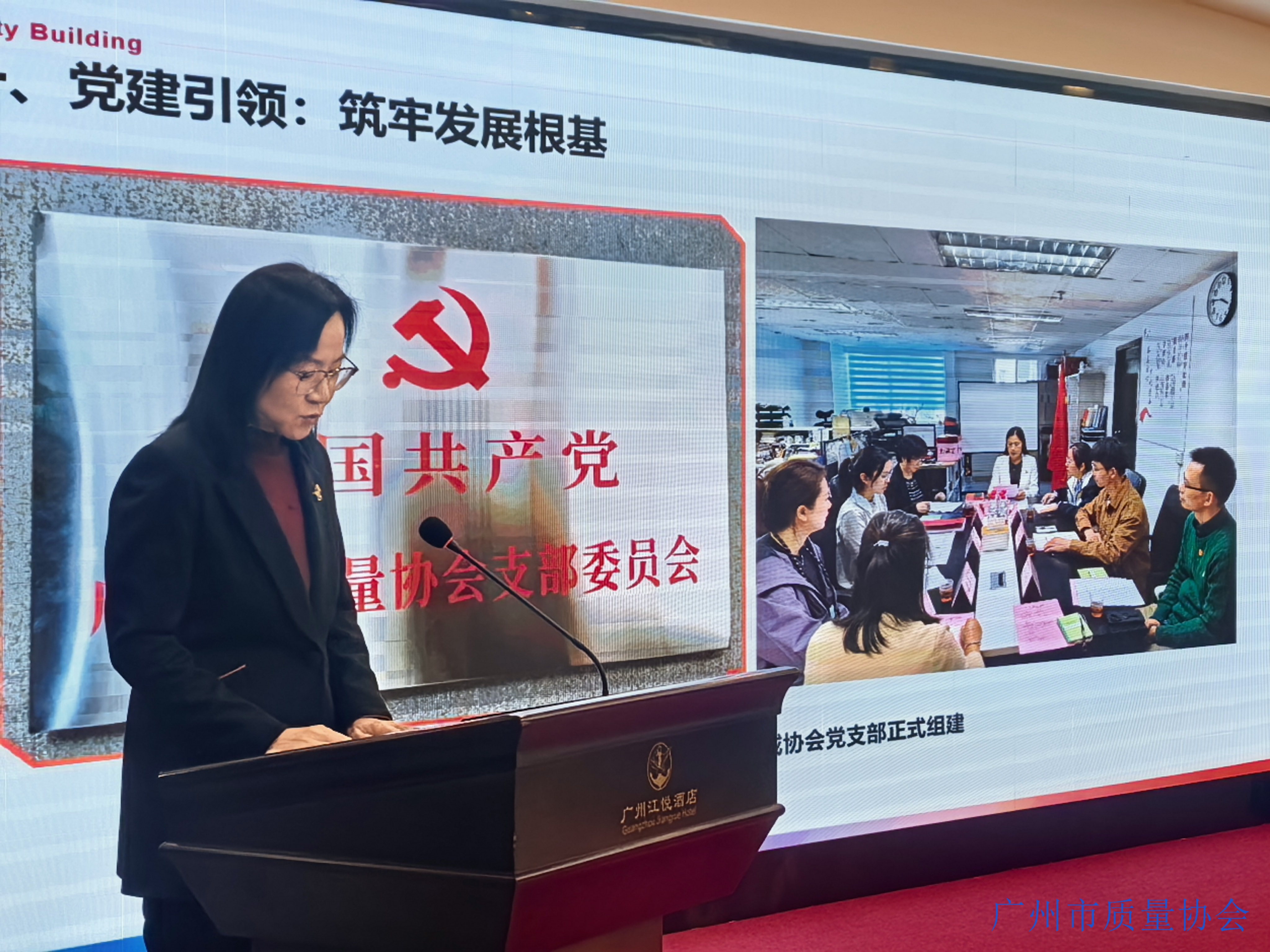广州市质量协会党支部书记、秘书长孔丽梅主持会议。协会会长王向钦作题为《党建引领启新篇 协会发展新纪元》的主题工作报告。报告指出,2025年是协会党建引领工作深化拓展的关键一年。协会于年前顺利完成党支部组建,确立了“以党建引领为核心”的工作导向,通过深化主题教育、完善组织架构、创新宣传形式三大举措,推动党建工作与质量服务深度融合。全年累计开展党的二十大精神专题学习5场次,组织红色教育基地沉浸式学习2次,党员和积极分子覆盖率实现100%。